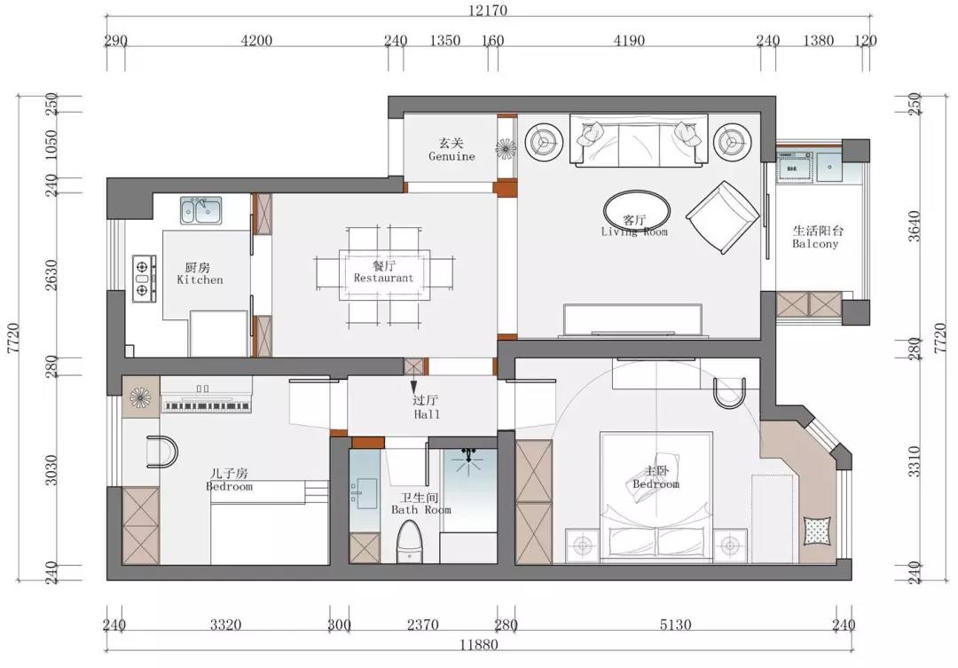 本案為86方三室兩廳設(shè)計,業(yè)主要求盡量簡約溫馨,注重環(huán)保和性價比,色系上主要用的是冷暖拼色和金屬色。