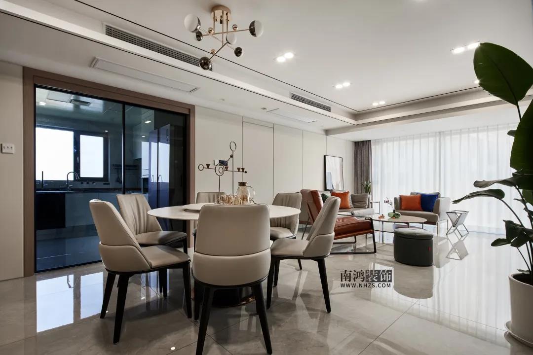 餐廳,高顏值的白色巖板餐桌用來搭載美味料理,皮質餐椅柔和可親,精致的金屬元素則貫穿始終。