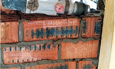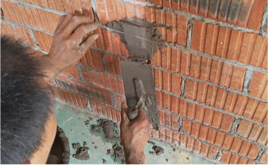 新砌墻體頂部九五磚雙向斜切磚縫抹灰均勻(嚴禁多孔磚側(cè)向砌筑)